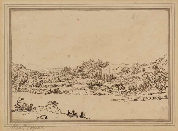 Editor: Turner’s "Scenes on the Kibble near Little Milton Hall, Lancashire," an ink drawing on paper, presents such a tranquil vista. I’m drawn to how the pen lines build texture and depth. What stands out to you in this work? Curator: It's interesting to consider Turner’s material choices in the context of his time. Ink and paper—common, readily available materials—allowed him a certain freedom in production, wouldn't you agree? The swiftness of line suggests an engagement with the industrialized landscape emerging around him, a direct response to immediate experience. How does this almost documentary style sit against the artistic labor implied by his later grand landscapes? Editor: That’s a really interesting tension! So, by using a readily available material like ink, he democratized art creation in some small way? He moved from detailed production toward instant capture... Curator: Precisely. Consider also the accessibility of landscape imagery. What purpose might such readily produced, transportable images have served at the dawn of mass tourism? Editor: So this was consumed both by local gentry who could perhaps commission something grander but also distributed more broadly as souvenir imagery accessible to those visiting Lancashire? Curator: It highlights how “high art” and more accessible imagery co-existed, and often depended on similar material practices, with one often informing the other. This makes us re-evaluate Turner’s whole *oeuvre* considering who it served. Editor: This makes me think differently about all landscape art, really – as both a personal expression *and* a kind of early advertising. Thanks! Curator: It invites a consideration of not just the what, but the how and for whom – valuable lessons for all.