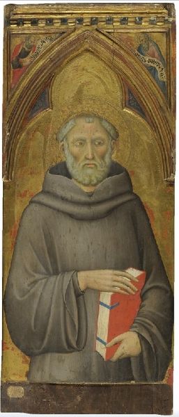 Curator: This panel, depicting Saint Benedict, was created in the 1320s by Segna di Buonaventura, an Italian painter working in the Sienese tradition. You can find it at the Metropolitan Museum of Art. What's your initial take? Editor: Hmm, immediately I’m struck by how…grounded he feels, despite the gold leaf background. Almost earthy, with that deep brown robe against the shiny, celestial gold. Makes me think he’s a saint for the everyday person, somehow. Curator: Precisely! Benedictine monasticism, even then, emphasized practical living, labor, and learning. Consider the period: fourteenth-century Italy, rife with political and social unrest, but also a flowering of religious fervor. How might Benedict’s representation here respond to those anxieties? Editor: Well, that bright red book certainly stands out! Is it his to-do list? Seriously though, it is the Rule of Saint Benedict, right? Maybe it’s a reminder that even amidst chaos, there’s a structured path to find some meaning. Curator: The book certainly signifies his authorship of the Rule. But notice also his direct gaze. Segna presents him as a figure of authority, not in the sense of worldly power, but spiritual strength rooted in his teachings, challenging existing hierarchies. The placement of other holy figures also reinforces a cosmic connection. Editor: I hadn’t noticed the angel and what looks like another saint at the top! They seem tucked away, almost like celestial footnotes. But the way Saint Benedict holds that book, with those rough hands…he seems completely present, focused. Like, “Yeah, divinity’s great, but let’s get to work.” Curator: The physicality you describe reflects an artistic tension prevalent in the Sienese school. On one hand, a continued adherence to Byzantine conventions—the gold ground, hieratic representation—while on the other, an emerging naturalism and humanism, giving us access to his psychological dimension. Editor: It's like a visual conversation, isn't it? The artist pulling from both heaven and earth to paint Saint Benedict. So, this monk holding this shiny red book manages to bridge some kind of gap between divine order and the messy human experience. That’s pretty powerful. Curator: Indeed. This image of Saint Benedict provides a powerful intersection of spiritual aspiration and practical wisdom for the medieval viewer, but it provides for the modern viewer a window into this same dichotomy and intersection, one which still haunts us today. Editor: A reminder that we can find guidance in a good book and perhaps within ourselves? I like it! Time well spent.