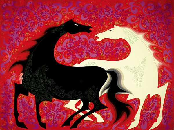 Eyvind Earle painted these Three Noble Horses with an enigmatic gaze, a testament to the animal's noble spirit. The horse, revered across cultures from antiquity to modern times, embodies power, freedom, and untamed energy. Here, the symbolic power of the horse gallops through the ages. Think of the steeds in the Parthenon frieze, symbols of Athenian might, or the horses of the Apocalypse, harbingers of transformation and chaos. Earle's horses echo this lineage but are rendered with a modern sensibility, their stylized forms and vibrant colors speaking to a contemporary audience. The horse, archetypally linked to virility and unbridled passion, also bears the weight of our collective hopes and fears. Just as the ancients projected their desires onto these magnificent creatures, Earle captures a sense of longing in their eyes, reflecting our own aspirations for freedom and connection to the natural world. Thus, the horse remains a powerful emblem, forever imprinted in our cultural memory.