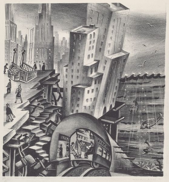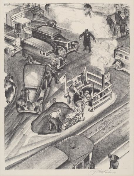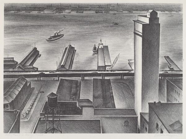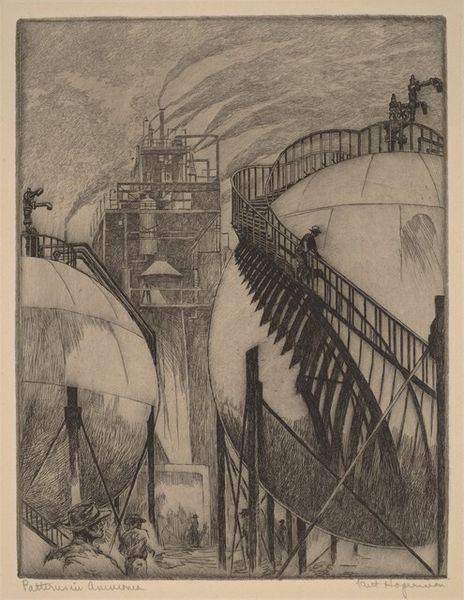 Curator: Let's turn our attention to "Downtown San Francisco From Montgomery Terrace - Telegraph Hill," an etching completed by Otis Oldfield in 1937. Editor: It’s got a melancholic feel, wouldn't you say? The density of the graphite mimics the dense urban atmosphere, the heavy smog feels oppressive. Curator: Oldfield was deeply interested in depicting the industrial landscape, focusing intently on the process involved in creating the built environment, which seems particularly visible here. Note how he foregrounds the textures of the street and buildings themselves. The lines almost vibrate. Editor: Right, and that process tells a story. The smoke stacks churning in the background point to production and consumption—the lifeblood, but also the potential self-destruction, of a rapidly modernizing society, a tension embodied here in the built versus the unbuilt. Think of all the manual labour constructing a city during that era. Curator: Precisely. The very materiality speaks to the period of tremendous building projects undertaken in San Francisco during the 30s, particularly connected to the Golden Gate International Exposition. We should observe the contrast with the car – mass production meeting the handmade and aging buildings. Editor: Absolutely. The lone car strikes me as particularly poignant, too, it feels symbolic of the aspirational, yet often unfulfilled promises of the era. Cars afforded freedom to a growing middle class, that didn't apply across the spectrum of race, gender, and class. There’s a real tension. Curator: The way the fog seems to engulf everything reinforces that tension for sure. This etching gives us access to that complicated interwar period, through its methods of making. The density of detail is fascinating in the work and effort evident. Editor: It reminds me that progress isn’t linear or universal. This artwork makes me ponder how societal promises actually play out and what or who is left behind. Curator: Yes, the work shows both the potential and the very real limits of the era's prevailing ideology of modernization and industrial development. Editor: Indeed. A dense picture offering a window into dense times.