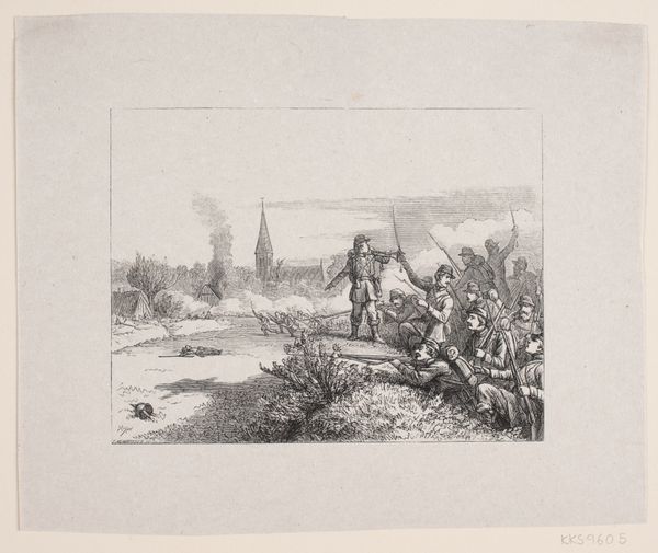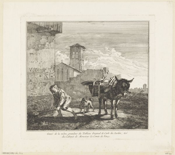 Editor: We’re looking at “Herders met kudde,” or "Herdsmen with Herd" by Félix Hilaire Buhot, created in 1881. It’s currently housed in the Rijksmuseum. It seems to be some kind of print, maybe an etching, and the light palette gives it this antique, almost dreamlike quality. What do you see when you look at it? Curator: The formal elements immediately strike me. Notice the division of space: the foreground with the herdsman, the middle ground filled with sheep, and the delicately rendered background that suggests a distant town. This strategic layering creates depth. Note also the artist's deliberate use of line; the fineness of the etching allows for subtle gradations of tone, building atmosphere. Do you observe the cloud formation and how the density impacts the overall mood? Editor: Yes, now that you mention it, the clouds contribute to a sense of muted drama, or impending weather perhaps? Also, is it typical to have all that space at the bottom? Curator: The space surrounding the image itself functions as a framing device. The materiality of the paper becomes part of the viewing experience. Consider the relationship between the etched lines of the scene and the blank space around it. It isolates the composition and invites close contemplation. Is there something within the composition that particularly intrigues you? Editor: I am wondering, what does that suggest to you in relation to the subject of herders and sheep? Curator: It offers a lens through which to appreciate Buhot’s formal dexterity. His conscious arrangement of elements within the pictorial space invites us to contemplate not only the scene but the means by which it is conveyed. The balance and counter-balance achieved within the rectangle itself contribute significantly to the viewing experience, divorced as it is from social considerations. Editor: Thanks for pointing out those formal aspects. It’s changed how I see it, to appreciate the construction itself.
