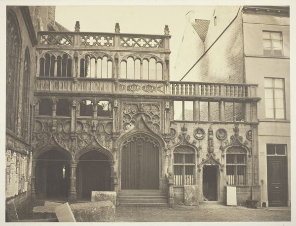 This albumen print captures the exterior of the Palais Jacques-Cœur in Bourges. The photographer, Delizy, presents us with a detailed view of this fifteenth-century architectural marvel. The image allows us to consider the cultural and social implications of preserving and representing historical landmarks. Bourges, in central France, with its rich history and architectural heritage, became a subject of interest during a period of intense national identity formation. Photography, a relatively new medium at the time, played a crucial role in documenting and celebrating such sites, contributing to a sense of national pride. The Palais Jacques-Cœur itself symbolizes the aspirations of a rising merchant class challenging the traditional social hierarchy. Delizy's photograph, now housed in the Rijksmuseum, also serves as a historical document, reflecting the institutional practices of collecting and preserving cultural artifacts. To fully appreciate this work, scholars might consult architectural histories, social studies of nineteenth-century France, and museum archives.