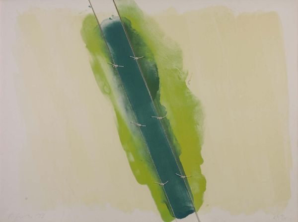 Editor: So, this is Joel Janowitz's watercolor, "Plunge," at the Harvard Art Museums. I’m struck by how the loose washes create a sense of shimmering light on the water. How do you interpret this work within a broader artistic or social context? Curator: Janowitz created this during a period when watercolor was gaining recognition as a serious medium, moving away from purely amateur status. How might the scale of the work—those large dimensions—contribute to its public reception? Editor: That's a good point, its size gives it a presence that demands attention. Curator: Exactly! It’s meant to be seen, to be considered, and to contribute to a broader dialogue about the role and value of landscape art in our culture. Editor: I see. The scale elevates it, declaring its importance. Thanks, I hadn’t considered that before! Curator: My pleasure. It's about understanding how art stakes its claim in the world.