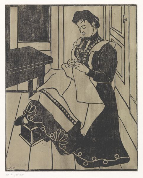 Editor: So, this is Samuel Jessurun de Mesquita's "Vrouw aan kaptafel", made around 1899. It's a woodcut and ink drawing. The stark contrasts and intimate scene create this intriguing, almost haunting mood, don't you think? What captures your imagination when you look at this piece? Curator: Haunting, yes, absolutely! The moodiness feels so... Dutch! What I find captivating is how Mesquita captures a quiet moment of introspection. She is grooming, preening in some ways, yet lost in thought. Do you get a sense of voyeurism here, like we are glimpsing something secret? Editor: I do, there's this sense of being an uninvited guest, peering into her private world. What's fascinating to me is how the patterns, especially in the wallpaper and tablecloth, contrast with the smoothness of the woman's face and arms. What can we say about the artist’s style and symbolism in this drawing? Curator: It certainly is of its time. Symbolism loved a layered pattern! De Mesquita beautifully uses stark contrast, almost as a sort of flattening, typical of woodcuts. Look closely and it suggests the influence of Japanese prints, the "Japonisme" that swept through Europe back then, with its elegant simplicity and focus on everyday life. Are we simply looking at a woman brushing her hair, or is Mesquita trying to hint at the vanity and superficiality of turn-of-the-century bourgeois life? Perhaps he felt there was a tension. A question of authenticity maybe, beneath the frills and fancies. Editor: Wow, I hadn't considered the Japanese influence so explicitly, nor this idea of the "authenticity". It feels so simple but it holds so much, you know? I keep thinking that art has the potential to uncover questions you hadn't even considered at first. Curator: Exactly! Isn't it the questions that keep us coming back, not necessarily the answers? Thanks, your take has certainly enriched my vision on this woodcut and it also inspired me, if I may add.