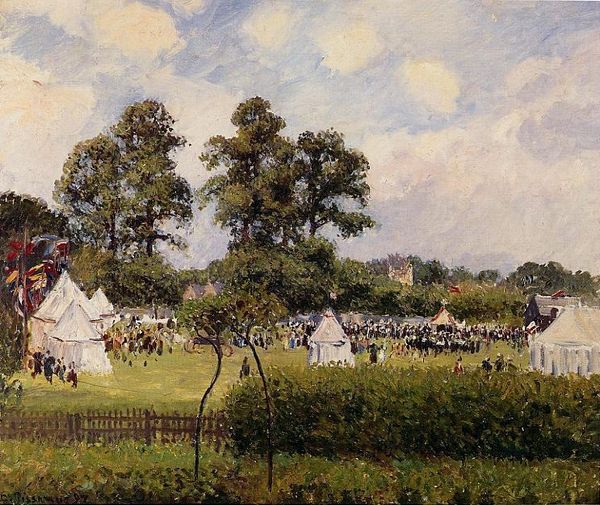 Giuseppe de Nittis's Return from the Races is an oil on canvas, a medium firmly rooted in the fine art tradition. But it is the way Nittis handles the paint that makes the picture so interesting. Look at the scene: horse-drawn carriages, fashionable onlookers. Nittis was clearly interested in depicting the leisure activities of the Parisian elite, and yet the dappled brushwork introduces a democratic spirit. The artist's feathery strokes don't discriminate between the figures and the foliage, between the top hats and the trees. This application of the oil paint blurs the lines between the materiality of the subjects represented and the artistic technique used to depict them. The painting becomes less about accurate representation and more about the physical properties of paint itself. The gestures are quick and sure, yet they evoke the slow, patient accumulation of detail that make up the social scene. By emphasizing process, Nittis suggests that the making of the painting is as important as what it depicts.