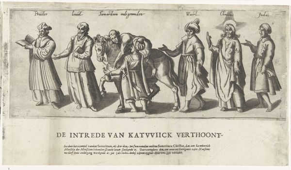 Curator: My first impression is how much detail is packed into this monochrome print! It feels like a small world teeming with characters. Editor: That's a perfect way to describe it. What we're seeing is a print called "Procession by the Chamber of Rhetoric De Lelykens onder de Doornen from Noordwijk, part two," created in 1607 by an anonymous artist. It's an engraving housed here at the Rijksmuseum. Curator: Engraving is such a demanding technique, isn’t it? The level of control needed to carve those fine lines into a metal plate, the way light plays across the printed surface, it’s all part of its appeal for me. You really see the hand of the maker. Editor: Absolutely, and that process gives us access into the cultural world it came from. These aren’t just random figures. The inscription refers to a Chamber of Rhetoric, a dramatic society, suggesting this print commemorates a theatrical performance. Chambers of Rhetoric played an important role in public life, staging plays for civic events. Curator: And you can feel that public role reflected in the deliberate costuming, look at the fabrics and garments each person is adorned with. This Midas character, especially. You get a sense of social standing even through the material properties rendered in print. Editor: Right, the attire, coupled with those identifying names – Judas, Ananias, Saphira, Midas – it's like a morality play condensed into a single image. A series of well-known allegorical figures that people would have easily recognised back then. Each represents some sort of moral lesson or story. Curator: It makes me wonder about the paper it's printed on as well, the supply chains, distribution networks... that image would have been widely reproduced. Editor: The printing and distribution of these types of images, particularly of allegorical performances, speaks volumes about the cultural and political landscape of the time. Prints such as these help construct the narrative of Northern identity in the 17th Century. Curator: For me, seeing these different hands from history – the artist, the rhetoricians, even the printer, all collaborating and leaving this imprint on materials is fascinating. Editor: I agree. Examining prints like this offers insights into social structures of the era. I would add that prints like this give us an entryway into 17th century public performance, too, allowing a richer understanding of the lives, thoughts, and cultural products of early modern Northern Europeans.