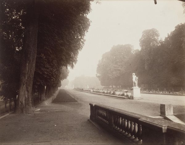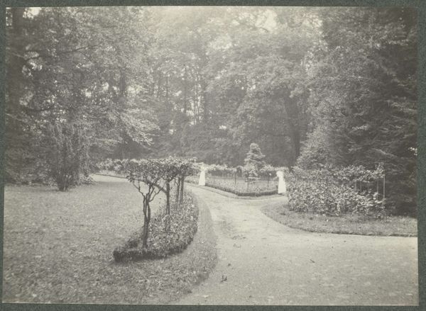 Editor: Here we have Geldolph Adriaan Kessler's "Twee dames Kessler op een tuinpad bij Landgoed De Paauw," circa 1913. It’s a photograph, and I find the figures so dwarfed by the landscape; there's a real emphasis on the setting itself. What strikes you most about it? Curator: For me, it’s the material process itself. Look closely; the soft focus, almost dreamlike quality isn’t an accident. Kessler was clearly engaging with Pictorialism, manipulating the photographic print itself to emulate the aesthetics of painting. Consider the labor involved. It’s not a snapshot; it's crafted. Editor: So, you are saying it's more than just documenting reality; it's manipulating it through technique and materials. Curator: Exactly! The platinum printing process he likely used, popular then for its tonal range and matte surface, adds to this effect. It separates the image from the slickness of commercial photography. We should consider how this hand-crafted aesthetic elevates photography closer to the traditional "high art" forms like painting. But who benefits from this elevation? Editor: Good point. And the subjects – two women, presumably the Kessler sisters – what do their roles say about the context in which this work was produced? Curator: It tells a story of leisure and class, doesn't it? The Kessler family’s wealth afforded them this lifestyle, this estate. And that leisure facilitates artistic exploration with novel photographic techniques, ultimately blurring the line between work and artistic expression. Is photography truly democratized, or is access still governed by financial resources and available time? Editor: This makes me think about access. I hadn't considered that the very process embodies a class distinction. I appreciate you sharing your view! Curator: And I, yours. It highlights the complex interplay between artistic expression, materiality, and social power at play.
