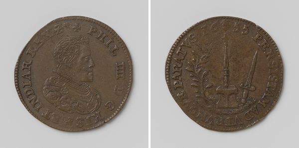 Here in the Rijksmuseum is a bronze coin depicting Filips II and Isabella, King and Queen of Spain, made anonymously. The coin, with its simple circular form, is divided into two distinct fields, each dominated by a profile portrait. The use of profile, a convention harking back to ancient coinage, lends a sense of formality and authority. The material's texture and the bas-relief technique invite a tactile interaction, suggesting the value not just of currency, but of rulership. The inscriptions form a semiotic ring, framing and thus reinforcing the central images of power. Consider how this coin destabilizes traditional portraiture by flattening the individuals into types. There's a tension between the desire to represent individual likeness and the structural demands of coinage. Does this tension underscore a deeper philosophical question about identity versus representation?