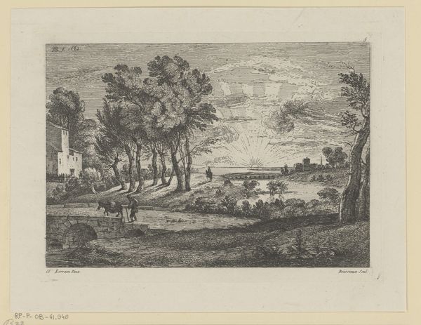 Editor: This is "Dance Under the Trees (Landscape with Rural Dance)," an engraving by Claude Lorrain, made in 1742. The scene feels very composed, almost staged, like a theatrical pastoral scene. What statements about society do you think Lorrain is trying to make here? Curator: Considering the period and Lorrain's other works, it speaks to the idealized view of rural life held by the aristocracy. It presents a fantasy, obscuring the realities of peasant labor and the hierarchical structures of power. It presents a specific intersection of wealth, leisure, and class, carefully constructed. Do you see any subtle indicators of this social positioning within the engraving itself? Editor: Well, the figures aren't really *working*; they're dancing or relaxing. There's no visible hardship. It's all leisure, like they're putting on a show for themselves. Curator: Exactly! This is key. Look at the landscape too. Is it wild and untamed? Or carefully curated and "picturesque"? Lorrain, though celebrated for his landscapes, often catered to the tastes of wealthy patrons, reinforcing their vision of an ordered, controlled world. His are less records of nature and more statements on ownership and social order. How might we relate this to contemporary concerns of environmental justice and the commodification of nature? Editor: I hadn't thought of it that way, but it makes total sense. It's less about the "dance" and more about who has the privilege to dance in the first place. It certainly opens up the image to a more complex and challenging interpretation. Curator: Indeed. Art gives us opportunities to decode historical narratives, revealing underlying assumptions about class, power, and the romanticization of labor. It highlights that art doesn't exist in a vacuum but is very much part of wider social constructs.