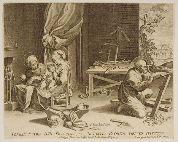 Curator: Philippe Thomassin's "Heilige Familie," created in 1597 and held at the Rijksmuseum, presents a domestic scene rendered as an engraving. My first impression is the detailed interplay between the family and the landscape visible through the open structure. Editor: It’s the sheer volume of things for me; this interior speaks volumes about labour, production and daily routines. It goes beyond depicting the Holy Family. Look at all these details – the tools scattered around, the textile production, all hinting at various modes of fabrication. It seems to blur distinctions between high religious art and the toil of crafting everyday objects. Curator: Absolutely, the inclusion of those crafting implements disrupts the traditionally idealized portrayal. Consider how Thomassin subtly weaves together narratives of spirituality, craft, and class. There’s Joseph the carpenter absorbed in woodworking, Mary caring for the child, while Anne, Christ’s grandmother, busies herself with a spindle; all of it emphasizes their reliance on self-made artisanal goods within the context of an increasingly market-driven Italian Renaissance. Editor: This positioning encourages us to investigate not just what is represented, but how these narratives relate to issues such as gendered labor. Anne’s work with the spindle and thread becomes interesting when we realize these roles have been devalued when contrasted with the tools used to build structures from the ground up. Thomassin reveals how certain labour activities and gender identities were ranked within societal value systems of the time. Curator: Fascinatingly put! While the visual space occupied by Joseph suggests significance through active construction, women in turn occupy a softer space dedicated primarily to home care – reflecting broader beliefs. These nuances illustrate Thomassin's sophisticated capacity for constructing intricate layers concerning religion and familial roles shaped by existing traditions Editor: Indeed, it is a perfect bridge. Looking at what is visible, how it was manufactured reveals social stratifications regarding access to capital goods – the availability of tools for men compared to expectations toward homemaking skills amongst the woman reveals not only what materials or devices can shape identities but those practices influence both community ideals surrounding roles expected of people depending gender constructs from any given social fabric at particular moments of civilization such those happening when viewing "Heilige Familie". Curator: I find myself reflecting on how a seemingly classic depiction offers such profound engagement thanks entirely towards intricate execution combined sophisticated interpretation social factors shaped during era; there's such brilliance throughout – every single feature serves both expressive religious dedication all while representing critical views within context human history – Thomassin effectively immortalizes them across paper which prompts us contemplate connections today between meaning past representations versus its ongoing consequences experienced. Editor: This experience has enriched appreciation and reflection when thinking beyond simple aesthetics instead delve material processes employed in constructing society where everyone lives based cultural ideologies influencing perceptions within each piece crafted so far… "Heilige Familie", by Thomassem really invites a second even longer reflection now on human ingenuity, beliefs combined challenges throughout creation, progress while existing even amongst such profound questions!