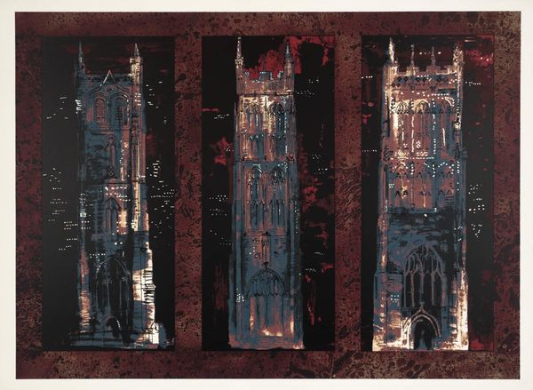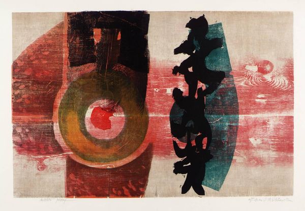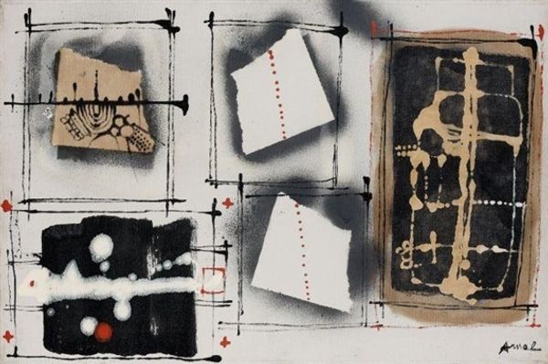 Editor: This is John Piper's "11. Inglesham, Wiltshire: A Rustic Medieval Interior." I’m really struck by the composition. It's almost like an abstract stage set. What do you see in this piece? Curator: The formal qualities are quite compelling. Note the stark contrasts between the monochrome blocks and the textured surfaces. Observe how Piper creates depth through layering and the strategic placement of shapes. The limited color palette reinforces the architectural subject matter. How do these elements contribute to the overall reading? Editor: It feels very architectural, almost like blueprints or fragmented memories of a building. Curator: Precisely. It is interesting to consider how the artist uses abstraction to capture the essence of a space, rather than a literal representation.