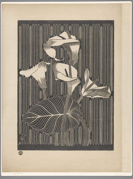 Curator: This etching, entitled “Bloeiende Cactus,” or “Blooming Cactus,” by Theo van Hoytema, part of the Rijksmuseum collection, has this incredible stark beauty. The composition emphasizes the drama and fragility of the blooms. What’s your initial impression? Editor: My first thought is that the image is almost gothic. There’s a Victorian obsession with botany mixed with this undercurrent of…decay? Or maybe just the temporality of beauty. Curator: I agree, and it’s enhanced by Hoytema’s distinctive technique. The textures achieved through the etching process give it this very tangible feel, you almost want to reach out and touch the velvety petals or feel the prickles of the cactus. It has the charm of an old engraving style with very sensitive lines. Editor: I'm particularly drawn to the background, these ghostly swirling patterns against the dark ink, suggestive of almost cellular life. In its own way, it gives this work its subtle Art Nouveau inflection, especially its decorative aspect. I see in this drawing an effort to connect us to plant-life using abstracting symbols, to imagine how nature sees itself reflected. Curator: Exactly! The contrast makes the ephemeral blooms appear so delicate. In my perspective, he captured not just the visual appearance, but a whole evocative and transformative emotional response to that kind of blossoming. Editor: I appreciate how Hoytema situates a natural form against an unnatural one, blurring the distinctions between them to heighten the aesthetic and symbolic drama. After all, the natural has never really been separate from cultural representation; our perception is inevitably conditioned. Curator: Precisely! And there is also something profound in highlighting that temporality of flowering within such a sturdy, resilient plant. Perhaps an echo of our own fleeting existence? Editor: Ultimately, I feel it draws us to question what constitutes 'natural' versus 'artificial' in both art and in how we structure our experiences. Thank you, Theo van Hoytema, for prompting a new set of interrogations for us here. Curator: Absolutely, thank you for the insight. It reminds me to celebrate those beautiful moments of flourishing amidst, maybe despite, the prickles of daily life.