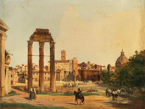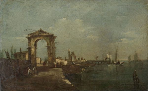 Francesco Guardi painted "Caprice, avec arc triomphal en ruine et paysage du bord de la lagune" using oil on canvas, inviting us into a world of architectural fantasy. At first glance, we see a monumental arch dominating the foreground, its aged bricks and solemn presence framing a distant lagoon landscape. Guardi masterfully plays with perspective. The arch, though ruined, acts as a proscenium, directing our gaze towards the detailed yet hazy background filled with buildings and human figures, which gives a theatrical structure to the work. Notice the use of light; Guardi captures the Venetian atmosphere with soft, diffused light, which lends an air of romantic melancholy. The painting employs a ruin which is a semiotic sign that acts as a cultural code signifying not only the passage of time but also the transience of human achievement. In essence, Guardi’s caprice is a stage where reality and imagination intertwine, challenging our perceptions of space and history. The painting stands as a reminder of art’s capacity to reshape our understanding of the world through a combination of the real and the imagined.