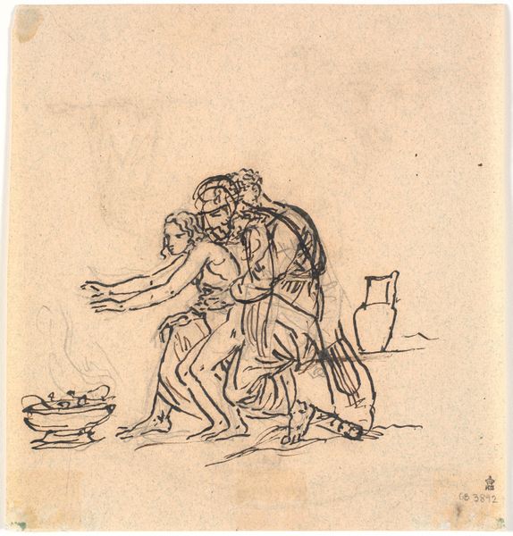 Editor: Here we have Ernst Willem Jan Bagelaar's "Vrouw met zwavelstok en lamp", dating sometime between 1798 and 1837. It’s an ink drawing, very sketch-like. It feels... grounded somehow, very immediate. What catches your eye when you look at this piece? Curator: I'm immediately drawn to the materiality of it – the ink, the pen strokes on paper. Notice how the varying pressure of the pen creates a sense of light and shadow, almost sculpting the scene. It invites questions about the availability and quality of the materials Bagelaar used and how those might influence the aesthetic we see. Also, consider the societal context – who was consuming art made with these relatively accessible materials at this time? Editor: That’s interesting, I hadn’t thought about the material accessibility. How does that relate to the subject matter, a woman with a sulphur match and lamp? Curator: Well, the subject herself hints at labor and domestic life. Sulphur matches were a relatively new invention at this time. This drawing potentially highlights a shift in labor practices, domesticity, and possibly even the rise of consumer culture related to the production and distribution of these new materials. Editor: So, it’s not just about the image, but also the production of the materials within it and that of the artwork itself? Curator: Precisely. How does Bagelaar's choice to use simple pen and ink connect to the woman's work depicted? Is he making a comment on the everyday, contrasting "high art" materials with a mundane scene? Editor: I see your point. It really grounds the image and shifts it away from just being a quaint genre scene. The making of it becomes integral to the story. Curator: Indeed. It pushes us to think about art not as isolated beautiful objects, but as things rooted in a network of materials, labour, and societal change. Editor: That definitely gave me a different way of looking at it! I never considered the implications of the materiality this deeply.