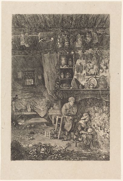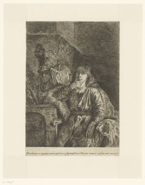 This etching, "Filosoof in zijn studeerkamer gestoord door een boze vrouw," was made by Louis Antoine Carolus, a 19th-century Dutch artist. It offers a window into the cultural tensions surrounding intellectual life during that period. The image presents a scholar engrossed in his studies, complete with scholarly paraphernalia like books and globes, disrupted by an angry woman peering in from above. Created in the Netherlands, this scene subtly comments on the social structures of its time, particularly the domestic sphere versus the world of male intellectual pursuit. The artist uses visual codes to create meaning, contrasting the contemplative space of the philosopher with the intrusive, perhaps exasperated, figure of the woman. To fully appreciate the work’s cultural context, we might delve into period literature, domestic advice manuals, and even census records. These resources enrich our understanding of the shifting roles and expectations placed upon men and women during Carolus’s time, and the public role of art. The image’s meaning is contingent on these wider institutional and social contexts.