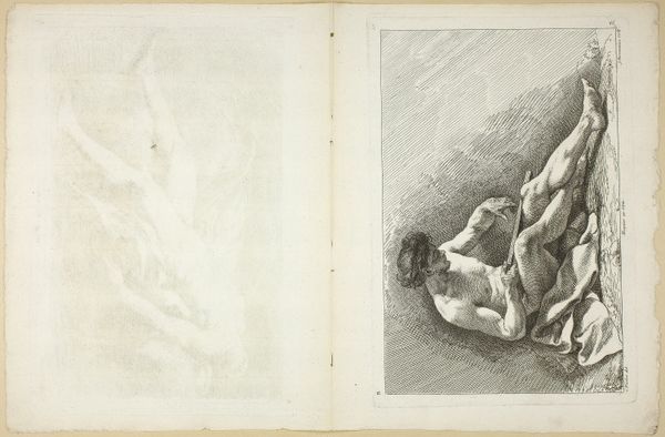Curator: My first impression is quiet contemplation. The pose and the soft engraving lines create a rather pensive mood. Editor: Well, let’s place this in context. Here we have "Partially Nude Man Reclining on Clouds," plate 8 from Antonio Maria Zanetti II’s book of engravings "Frescoes by the Most Important Venetian Masters," published in 1760. Curator: Venetian masters, frescoes, clouds… immediately this suggests to me a divine figure, perhaps a god from classical mythology. The lack of identifying symbols intrigues me. Is it meant to be ambiguous? Is that part of its potency? Editor: Possibly. As an engraving, it serves a vital public function of documentation. These prints disseminated Venetian frescoes, often depicting mythological scenes or allegorical figures, to a wider audience. They acted as records of significant cultural achievements and architectural adornments. Curator: I see the visual echo of classical ideals of male beauty, almost Michelangelesque, reborn in the Venetian Republic. How much does this print reflect the aesthetic and even political climate of the time? Are they subtly reminding themselves, and us, of a glorious past? Editor: Indeed. These kinds of images actively built and maintained a particular cultural narrative. Venetian elites cultivated an image of themselves as inheritors of classical grandeur and the art promoted that heavily. The male nude, especially, carries enormous weight throughout history. Its role has morphed as a site for reinforcing ideals, or in other cases, contesting the dominant societal viewpoint. Curator: I’m drawn to the tension in the figure itself. The partially draped cloth suggests modesty but cannot fully obscure the sensuality. What does this deliberate revealing and concealing communicate? Editor: Well, remember, that these idealized nudes also expressed specific, culturally constructed ideas about virtue and citizenship. They're not merely beautiful objects. They're loaded with significance, projecting an idealized image of Venetian civic identity. The very act of producing and circulating such images becomes a form of cultural pronouncement. Curator: Interesting. The work offers layers, then—a document of artwork and, at the same time, a reflection of the desires and values held by its culture. Editor: Precisely! And now when you return to the print, perhaps you can see all that interwoven history contained within the reclining figure. Curator: I will. Thanks for untangling some of those threads.