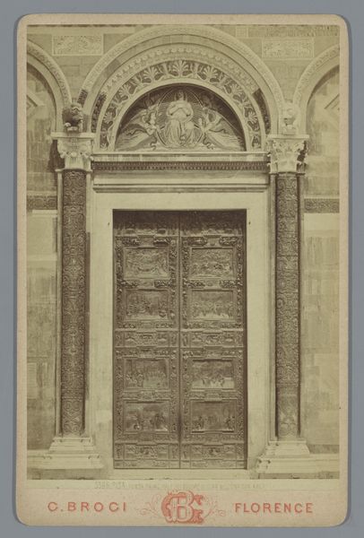 Curator: What a stately image, this print, a photograph by Paolo Lombardi, depicts a door, specifically, "Deur naar de zaal met het doopvont in het Battistero di San Giovanni in Siena" – or Door to the Hall of the baptismal font. Dating probably between 1875 and 1900. It's quite impressive. Editor: Imposing is the word that springs to mind. The sheer density of that doorway, the texture of the stone—it really grounds the image. There’s a feeling of permanence. I wonder about the context it presents: are we meant to see this grandeur and contemplate its social function? Curator: Precisely. The architecture of this photograph suggests institutional power and civic identity. This is not simply an image of a door but the gatekeeper to sacred space, documented to present an architectural marvel that promotes the grandeur and legacy of Siena. The photograph functions almost as civic marketing, showcasing the city’s artistic and cultural depth. Editor: Looking closely, the method of production stands out, as a printed photograph. One imagines the labour and decisions that shaped this. The choice of perspective, the printing process itself - the sepia tone creating an almost antique effect, reinforcing the historical weight. Consider its distribution - postcards for the budding tourist industry, perhaps? Curator: That is very likely. Photography's relatively new ability to cheaply disseminate architectural marvels democratized access. Individuals far from Siena could ponder and purchase this image, consuming it as a symbol of Italian history and artistry. It created a shared visual language, boosting both the city's status and the market for artistic imagery. Editor: This image presents the politics of access and representation: who gets to document, who consumes the image, and what story does it serve to tell about Siena, and more broadly, Italian cultural patrimony? Curator: A beautiful thing can serve many functions, be they political or material, aesthetic or useful. Editor: And this photograph invites us to think about just how many layers there truly are. Thanks for guiding us. Curator: My pleasure, until our next visual journey.