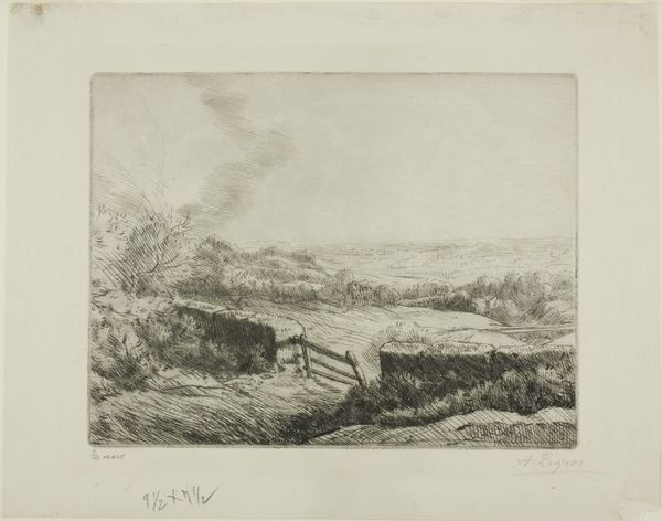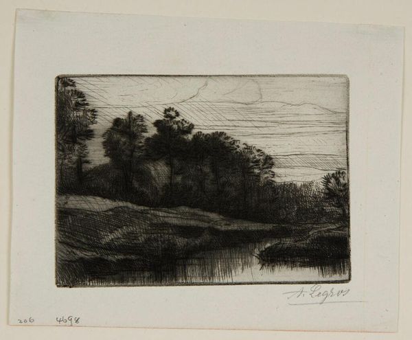 Curator: Alphonse Legros' etching, "The Washer," portrays two women engaged in laundry by a stream. The lack of a precise date invites us to consider its timeless qualities. What strikes you first? Editor: There's a quiet dignity in their labor. The composition, though simple, speaks volumes about the lives of working-class women and their connection to the landscape. Curator: Legros was deeply engaged with the social realities of labor. Consider the repetitive, physically demanding nature of washing clothes by hand—the constant immersion in water, the struggle against dirt and stains. Editor: Exactly. And we can't ignore the broader context: these women are performing essential work, yet they're relegated to the margins, both socially and economically. Their labor is often invisible, unacknowledged. Curator: The etching process itself reflects a kind of labor. Legros meticulously scratches into the metal plate, creating lines that capture the light and shadow of this scene. There's a direct connection between the artist's hand and the final image. Editor: By depicting this everyday scene, Legros challenges the hierarchy of subjects in art. He elevates the ordinary, giving voice to those who are often silenced. It's a powerful act of representation. Curator: Indeed. It makes you wonder about the hidden costs embedded in the cleanliness of everyday life. Editor: It certainly prompts reflection on whose labor sustains our comfort and convenience.