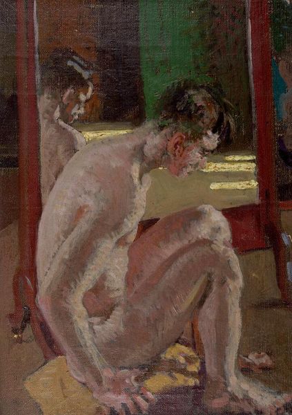Curator: Here we have Denman Waldo Ross’s oil on canvas, "Portrait of a Young Man Leaning Head on Table," housed here at the Harvard Art Museums. Editor: Oh, there's such a quiet sadness in this piece. It's like a memory half-formed, the kind you chase but can’t quite grasp. Curator: The pose, the almost classical drapery... It feels like a symbolic rendering of melancholy, perhaps even a nod to classical depictions of mourning. Editor: I think the blurry, dream-like quality of the painting adds to this sense of being adrift, don't you? I get this feeling that time has no meaning here. Curator: Exactly! And I think those three spheres on the wall could symbolize something too, maybe something related to a past ritual or tradition. Editor: Maybe. Or maybe they're just lamps, casting a strange light on a young man's bad day! I guess it’s up to us to decide what it evokes. Curator: Indeed. What a remarkable piece to meditate upon the transience of youth and emotion. Editor: A lovely invitation to consider the mysteries that linger in the half-light of our own personal histories.