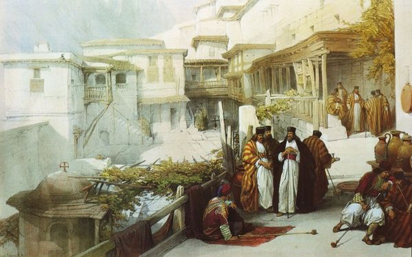 Curator: Here we have Alphonse Mucha’s, "The Introduction of the Slavonic Liturgy," completed in 1912, and held at the Mucha Museum in Prague. Mucha used watercolor and gouache in its creation. What strikes you first? Editor: Hmm. It feels like a hazy memory. The golden light bathing everything gives it this sort of… ethereal, dreamlike quality. Figures floating in the air. Almost like they are watching over the events unfolding below. Curator: Mucha's attention to materials really drives that feeling, right? Watercolor and gouache, often considered less prestigious than oils, offer this fluidity. But that belies the complex layering he employs, which creates depth and light—a tension between material humility and crafted grandeur. It’s very Art Nouveau in that respect, and fitting considering his poster work. Editor: Absolutely! And the use of those paler tones creates an incredible softness—though, thinking about it, those angelic figures are looking pretty Byzantine, icons suspended above a human drama. They seem almost trapped or supported within a light cloud...like floating on holy clouds. The scene below, though, has quite an intense focus...it's theatrical somehow. Curator: This "theatrical" air makes perfect sense when you consider Mucha's historical context and ambitions beyond Art Nouveau. Mucha invested considerable time and research into crafting these kinds of images depicting key historical events. The Slavonic liturgy was of huge political and cultural significance to Czech identity and pride at this time, of course, as was the making and widespread distribution of these sorts of artistic pieces. Editor: Right, it speaks of heritage. That’s so interesting, because the way he contrasts those "earthly" and "spiritual" elements—that interplay makes it a pretty moving reflection on faith. But is that fair to ask an object, or a person even, to bear so much cultural weight? That's a discussion in itself, I suppose. Curator: Well said. That complex weight might make one want to look more critically at how objects and the making of images operate within culture... Perhaps on a further visit. Editor: Absolutely. Makes you wonder what other stories the picture might like to whisper if we came back.