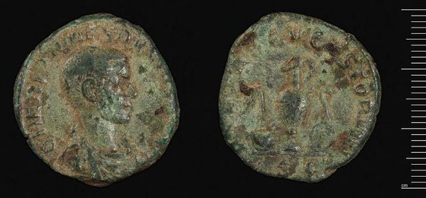 Curator: This is a sestertius of Trebonianus Gallus, currently held at the Harvard Art Museums. The piece weighs in at about 13.86 grams. Editor: It feels ancient, you know? Like holding a little piece of history that’s been through a lot. A tangible, if worn, relic. Curator: Coins like this offer valuable insights into the political and economic landscape of the Roman Empire during Gallus’s brief reign, reflecting imperial power and propaganda. Editor: It makes you wonder about the hands it passed through. What stories did those hands hold? Curator: Examining its iconography and inscription provides critical insight into how Gallus wished to be perceived and the values he sought to promote during a period of crisis and plague. Editor: I guess seeing history etched onto something so small… It’s a reminder that big empires are built, and crumble, coin by coin, person by person. Curator: Precisely. This coin is a potent symbol of that complexity. Editor: Exactly! History whispers when you listen closely.