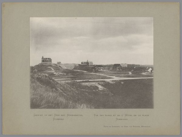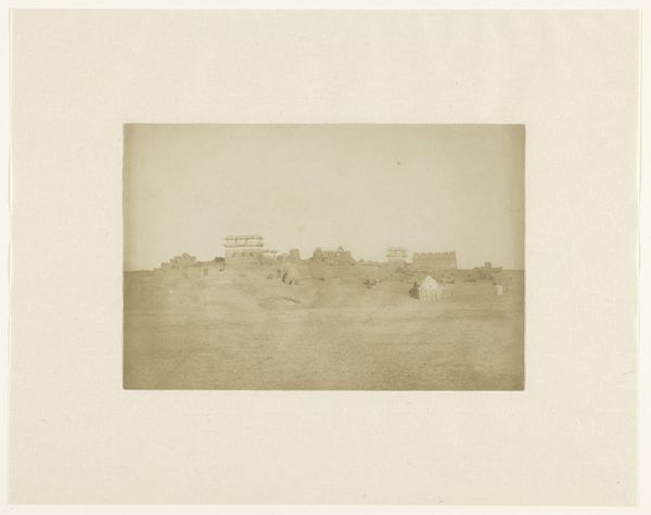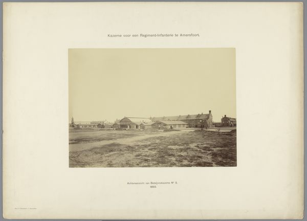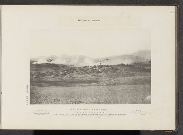 Curator: Looking at this photograph, purportedly taken in 1894, showing “A general view of the King-Tse troops' barracks at Port Arthur," I'm immediately struck by the palpable stillness and sense of isolation despite the suggestion of military activity. What leaps out to you? Editor: It's quite bleak, isn't it? A stoic grey wash really flattens it out. It reads as a stark representation of the barracks themselves; this forbidding wall seemingly endless, like a monument or marker erected as some kind of symbolic border. Are these stone barriers perhaps reflective of societal divides at that time? Curator: Yes, that defensive wall—that imposing architecture— certainly symbolizes division and perhaps the anxieties of the era. This print is a kind of visual artifact, part of a larger effort to map and document a very tense geopolitical situation. Think about the gaze, the photographer positioning themselves, making decisions to reveal and conceal. Editor: Interesting. And look at the lone figure in the center! Does that draw emphasis on what is physically separating us, viewer and subject? Curator: Exactly! That single, tiny figure actually accentuates the massive scale, it's really more about emphasizing this wall. Think about the repetition of rectangular forms here, how they speak to military structure but also entombment. Perhaps, the artist hints that it would have been futile to scale or somehow transcend these boundaries in those tumultuous times. Editor: Absolutely. The composition is also carefully staged, isn’t it? With the darker foreground leading our eye to the barracks. The almost ethereal quality—likely due to the printing techniques— gives the subject matter the distinct air of a memorial; a haunting elegy rather than documentation. Even this choice gives added historical context. Curator: I couldn't agree more! What starts as seemingly a straightforward record transforms through those aesthetic choices into something far more psychologically charged. And it invites so much introspection from us still today. Editor: Precisely! Leaving us to contemplate walls real and imagined, visible and invisible.