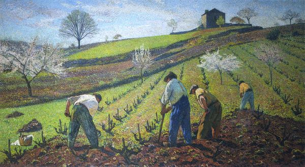 Camille Pissarro made this painting, 'The Gleaners', in France using oil on canvas. The image depicts rural workers gathering leftover crops from a field after the harvest. This was a traditional practice of the poor in Europe. We can consider it a form of informal social welfare. Here, Pissarro uses short brushstrokes and a bright palette, characteristic of Impressionism, to capture the light and atmosphere of the scene. However, the subject matter connects to Realism, which focused on everyday life, particularly of the working class. The history of art institutions often excluded such scenes. The Paris Salon, for instance, historically favored historical, mythological, and aristocratic subjects. By depicting gleaners, Pissarro challenges the norms of the art world and draws attention to the social realities of rural life in France at that time. The artist's political beliefs also influence the work, and this can be traced through historical documents, letters, and critical reviews of the time. These resources help to better understand the social consciousness of Pissarro and the cultural context.