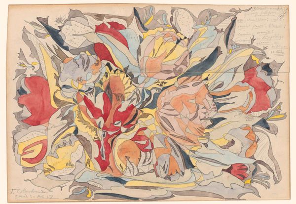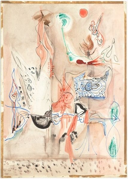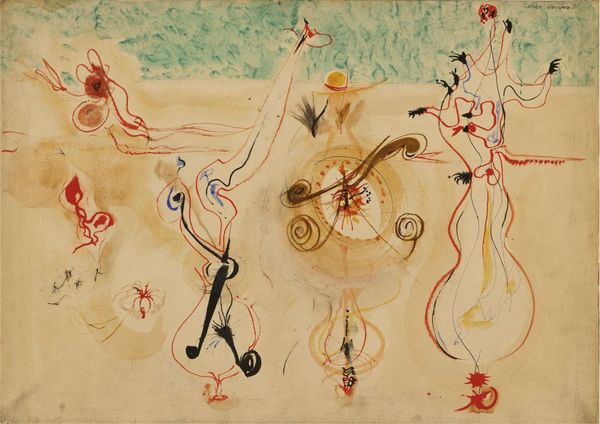 Curator: Ah, here we have Mark Rothko's "Birth of Cephalopods" from 1944. It’s a watercolor and drawing, quite unlike his later, more famous works. Editor: Immediately, I'm struck by its ethereal quality. The shapes are so fluid, almost like observing organisms through a microscope. The color palette has something childlike in its simplicity, too. Curator: It is surprising, isn't it? He's reaching for something primordial, delving into the very genesis of life. Notice how these biomorphic shapes suggest nascent forms struggling to define themselves, the vibrant yet fragile beginnings. It echoes Miró or even Masson, a similar engagement with Surrealist biomorphism. Editor: I’m curious about the title, "Birth of Cephalopods." It conjures images of evolution and origins, yet also speaks to a hidden language beneath the surface. Do you feel it’s that direct? Rothko and cryptic titles rarely align. Curator: Perhaps "birth" is symbolic here—a genesis of color, form, or even feeling itself. His titles often act as evocative springboards, suggesting broader realms. To think of cephalopods suggests primordial consciousness, perhaps? His employment of symbolic systems in that sense almost betrays an iconographical approach to rendering ideas and emotional information into the visible plane. Editor: That is fascinating, because I was almost ready to dismiss it as whimsical and airy. The delicate lines and gentle washes have a lightness that can be deceiving. But you're right, there's a definite underlying current, like an unfolding drama shrouded in gentle pastels. There’s the sense of a visual riddle, but a playful one. The more you ponder the more you have a glimpse of something universal. Curator: Yes! These tentative forms may represent primal drives and creative forces struggling to take shape. "Birth of Cephalopods" offers us a chance to peer into a realm of boundless potential, of embryonic life poised on the cusp of existence. It suggests something fundamental. Editor: Looking at this artwork makes you think that underneath apparent simplicity there is hidden symbolism that transcends time, just as art and its ability to provoke, makes an individual into an explorer of themselves, of history, of what lies beneath the obvious. Curator: Indeed, Rothko pulls back the curtain ever so slightly so we may imagine what it is to arrive. What potential blooms there for all of us?