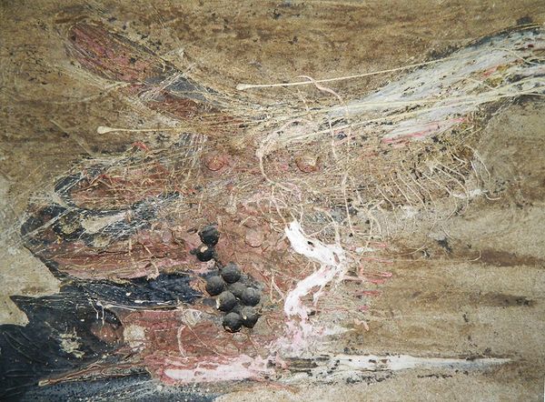 Editor: This is "Gossiping Mice" by Nathan Lerner, created in 1974, and it appears to be a mixed-media piece. It has an almost unsettling, gritty texture, and the forms feel really ambiguous. I'm curious, what stands out to you about this work, particularly considering the time it was made? Curator: What immediately strikes me is the tension between the title, "Gossiping Mice," which suggests figuration and narrative, and the reality of the artwork, which teeters on the edge of complete abstraction. In 1974, abstraction was already well established, but its social function was constantly being debated. Was it pure formalism, detached from the world, or could it still carry meaning? Editor: That's a really good point. So, where do you think Lerner falls on that spectrum? Is he commenting on society through abstraction? Curator: Perhaps. Consider the "gossiping" aspect. Gossip implies a social structure, communication, power dynamics. Even without discernible mice, Lerner could be suggesting these elements are still present, lurking beneath the surface of the abstract form. The monochrome palette, the almost violent gestures, might hint at the murkier sides of those social interactions. Think about the art world at the time, the clashing ideologies, the intense competition – could this be a commentary on that as well? Editor: I hadn’t thought of it that way! It's easy to just see abstract forms, but placing it in that social and historical context really changes how I perceive it. The aggression in the brushstrokes becomes much more pointed. Curator: Exactly. The beauty of art lies in how these interpretations can evolve over time. And our role, as viewers, is to actively engage with those possibilities. Editor: Definitely. It gives me a lot to think about regarding how we understand the relationship between art and the world around it. Thank you.
