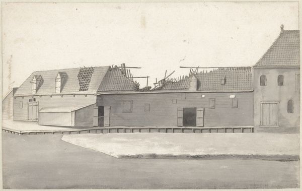 Editor: This is a photographic image entitled "Charity, Public: United States. Massachusetts. Bridgewater. State Farm: State Farm: Prison Yard." by Bass Photo. It shows the prison yard. What strikes me is the stark contrast between the open space and the confining architecture. What symbols do you see at play here? Curator: Notice how the building’s rigid grid of windows contrasts with the figures scattered along the wall. The wall itself is a potent symbol of separation and restriction, its height suggesting an insurmountable barrier. Do you see the lamp post? Editor: Yes, it feels like a lonely sentinel. Curator: It also represents surveillance and perhaps a glimmer of hope or guidance within this environment. Consider the word "Charity" in the title. Is this a commentary on societal views of incarceration and rehabilitation? Editor: That’s a complex idea. I hadn't considered the title as ironic. Curator: It certainly invites reflection on the duality of confinement and care. Editor: I see the image in a new light now, thank you.