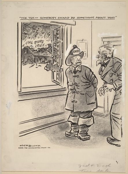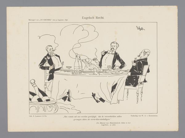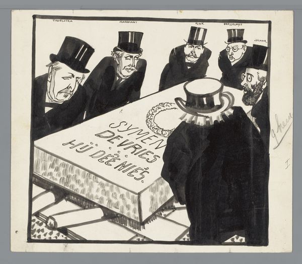 David Low created this pen and ink drawing called 'Pleasant Evenings Round the Fireside.' The composition uses an interesting juxtaposition of figures and objects within an interior space to create a narrative. The linear quality of the drawing gives it a crisp, immediate feel, while the limited color palette focuses attention on the forms and their arrangement. The figures, labeled with terms like 'Banks' and 'Obsolete Economists', are slumped around what appears to be a modern refrigerator. Low uses semiotic coding to create a visual commentary on economic policy. By positioning these figures in such a dejected manner, with discarded newspapers scattered around, the artist suggests a critique of the financial systems of the time. The use of a domestic interior as a backdrop further implicates these institutions in everyday life. The drawing challenges traditional notions of representation. By blending caricature with symbolic elements, it invites viewers to decode the relationships between form and content. This work becomes not just a snapshot of an era, but an invitation to question the structures that underpin our society.