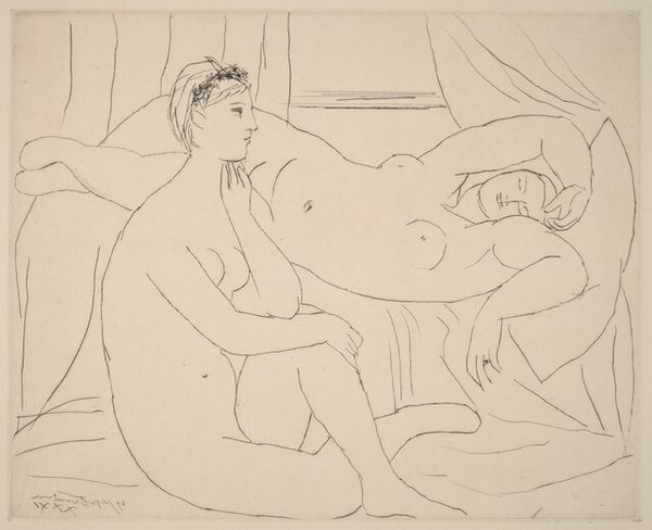 Editor: Here we have Ernst Ludwig Kirchner's drawing, "Couple," created in 1908. It's rendered with striking lines in ink, and the composition, even with its sparseness, feels quite intimate. What catches your eye when you look at this piece? Curator: Immediately, I'm drawn to the line work. Notice the economy with which Kirchner defines form. There's a tension between the delicacy of the orange contour lines and the more aggressive, almost crude, strokes in blue. How does that contrast strike you? Editor: I see what you mean. The blue seems to carve out shadows and adds depth, almost like a separate layer on top of the orange. Does the contrast in line weight signify a shift in artistic focus? Curator: Precisely! Consider how the heavier lines seem to compress the pictorial space. He is not attempting a realistic depiction. Instead, Kirchner emphasizes the subjective experience. Note, for example, how the bodies are intertwined yet almost flattened, emphasizing the picture plane. Do you perceive any expressive quality emerging from these distortions? Editor: Definitely. It makes the figures seem vulnerable, maybe even alienated despite their closeness. It pushes beyond mere representation into something emotionally charged. Curator: Indeed, it exemplifies early Expressionist principles where the artist privileges inner emotion over accurate representation of external reality. This interplay of line and form certainly contributes to the work's overall impact. Editor: So, by focusing on the lines and their relationships, we get a better handle on understanding its Expressionistic quality. Thanks for sharing your insights. Curator: My pleasure. Analyzing the formal components of the work certainly enriches the viewer experience.