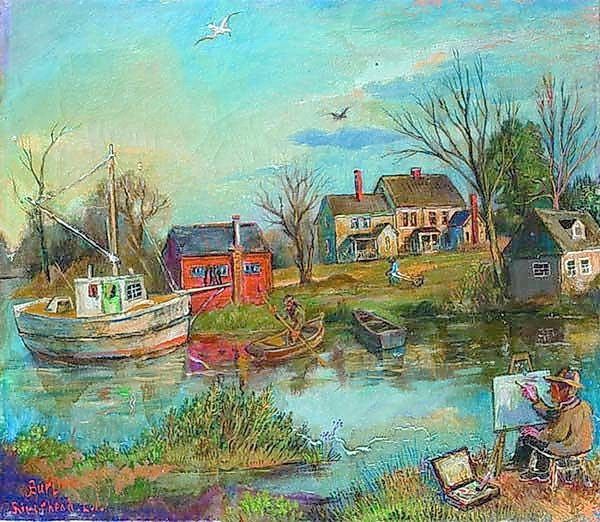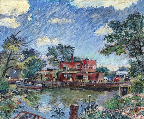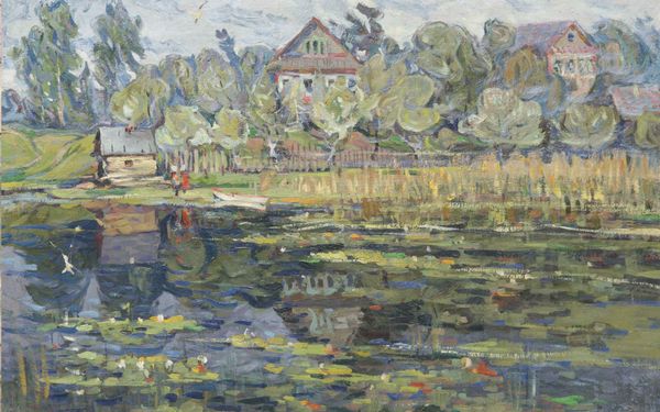 Curator: Here we have David Burliuk's "View of the Water," painted in 1947. It's an oil on canvas, capturing a rural lakeside scene. Editor: My immediate reaction is tranquility, even though there's a raw, almost crude energy in the application of paint. The reds are quite striking, hinting at perhaps a deeper emotional intensity beneath the calm surface. Curator: The brushwork certainly grabs your attention. Burliuk was deeply interested in materiality; look at the impasto! You can practically feel the thickness and texture of the paint. Considering that he was working during a time of mass production, his dedication to handmade quality speaks volumes. Editor: Yes, the texture enhances the symbolic reading too. The thick paint could be interpreted as a signifier of the earth's richness, reflecting a primal connection to nature. Also, the composition feels almost like a visual poem, with the boats symbolizing journeys or transitions, both physical and psychological. Curator: I see your point about the journey, and the boats indeed do point towards transport and trade—essential features in any riverside community of the mid-20th century. The way the artist utilized plein-air painting is particularly noteworthy; he made visible both the tradition of observational practice, but also how that could be adapted through an expressionist lens to depict material concerns such as climate. Editor: And did you notice how the little white building is placed perfectly to draw your eye, its symbolism of refuge perhaps amplified in the shadow of those vibrant, but perhaps transient, autumnal colours? There is an interplay of permanence and passing there which I cannot ignore. Curator: Exactly! It highlights a tension between natural processes, such as seasonal shift in resources, and permanent construction, perhaps an acknowledgement of how these impact one another and shape living. Editor: Considering Burliuk’s history and the influences present in "View of the Water", a cultural narrative unfolds about settlement and lifestyle choices which is both rich and challenging. Curator: Agreed, it’s about how social factors dictate lifestyle through labour practices, highlighting these communities' adaptation and creation of resources alongside these prominent waterways. Editor: I hadn't considered it in that way initially. Fascinating how a focus on material and production enhances its symbolism. Curator: Exactly! Each view builds our own reading of "View of the Water."