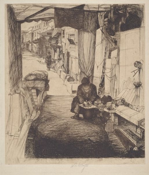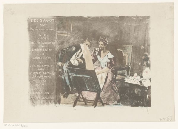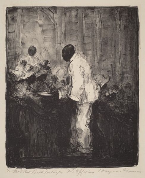 Curator: Welcome. Here we have Lesser Ury’s “Im Café Bauer,” dating to 1887, a piece rendered in watercolor and ink. It possesses a hauntingly serene mood, don’t you think? Editor: Haunting is the word. The tonal range here—the interplay of muted browns and sepia—contributes to a melancholic and intensely urban atmosphere. The brushstrokes are rapid, gestural…almost like capturing a fleeting moment, a feeling, rather than strict representational accuracy. Curator: It certainly evokes a mood—the late 19th century, the rise of the café culture in Berlin, intellectuals gathering to debate and create. Notice how Ury uses the light and shadow to emphasize their concentrated study of newspapers—in a time when printed news had massive social significance. Editor: Absolutely. The architectural structure here seems deliberate, those emphatic vertical strokes suggesting the imposing interior of the Café Bauer. Also, Ury cleverly employs what seems like a semiotic code – we interpret these men through their actions—reading. Each figure exists in his own private sphere even within a shared, social setting. Curator: Right—newspapers then are what personalized devices are now: tools to become alone together in public. Note also that their faces remain hidden or blurred. This anonymity reflects modern alienation; the rise of an individual within an ever-growing collective consciousness. Editor: A powerful commentary. The textural qualities achieved by ink and wash techniques, particularly how Ury blurs the boundaries between figures and setting, enhance the idea of detachment. It invites introspection regarding our relationship to physical and social space. Curator: It suggests a powerful tension: we see figures framed by the rigid lines of interior architecture that mirrors an existential rigidity. Yet, that stark formality is undermined by the blurry impermanence of newspaper, suggesting intellectual thought in all its evolving fluidity. Editor: Ultimately, Ury presents an uncanny portrayal. “Im Café Bauer” becomes an exploration into how interior and subjective experience can become irrevocably molded. A kind of mirror image where society reflects—distorted—within ourselves. Curator: Very true. It's a layered work, and a powerful reminder that our modern digital forms of media are also continuously shaping our experience in lasting, tangible ways. Editor: Yes. Ury’s piece continues to spark fresh discussion, offering insights regarding visual language and historical thought.