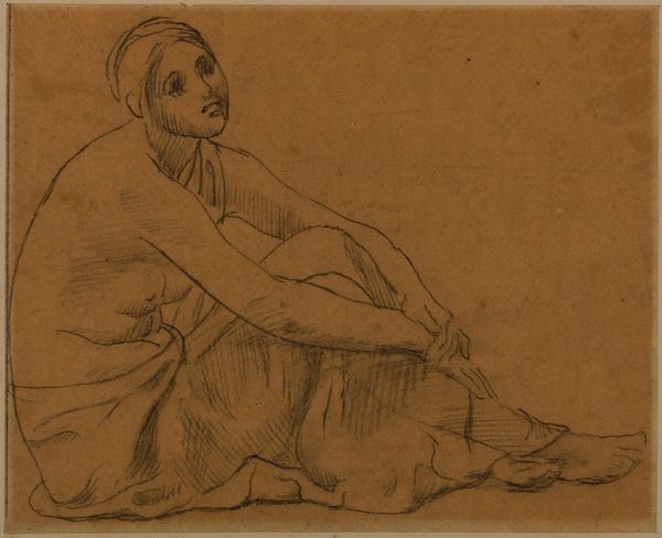 This sketch, "Study for Greek Girls Bathing", was made by Elihu Vedder using graphite and white chalk on paper. The artist’s hand is evident in the work's textures, which range from the soft blending of graphite to the more pronounced, almost crumbly texture of the chalk highlights. Vedder is exploring light and shadow in a tonal study, carefully considering the draping fabric and the form of the figure beneath. It gives us insight into the labor-intensive preparatory work that underpinned Vedder’s more elaborate paintings. Although it might appear spontaneous, the use of specific drawing techniques shows Vedder’s engagement with academic traditions. He wasn't just casually sketching; he was employing learned skills to represent an idealized form. Looking at this drawing, it's clear that even a preliminary sketch can carry significant cultural and artistic value, and provide insight into both Vedder's artistic process and the broader artistic conventions of his time.