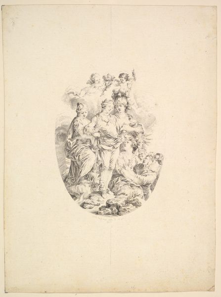 Editor: Here we have Jost Amman's "A Seated Personification of Charity with two Children," dating from sometime between 1539 and 1591. It’s a print, a pen-and-ink sketch. I find it really striking how this image, even rendered so simply, manages to convey such tenderness. What symbols or imagery jump out at you? Curator: Immediately, the very subject matter proclaims a well-worn iconography. Charity, or Caritas, as personified in this engraving, carries immense cultural and psychological weight. The nursing mother with children…does it bring to mind other, perhaps older, images? Editor: Yes! It reminds me a little of images of the Virgin Mary and Jesus. Curator: Precisely. This echoes earlier depictions, drawing a direct visual parallel, imbuing Charity with a maternal holiness. Look closely at how she’s situated – elevated on a plinth, set within an oval frame. Do those details resonate for you? Editor: The plinth definitely makes her seem more important, more…monumental. And the frame feels protective, like she's something precious to be preserved. Curator: Indeed. Amman deliberately situates Caritas not simply as a woman but as an enduring ideal, an emblem of a societal value. Note also the turbulent folds of drapery. Doesn’t it imply the ceaseless movement of generosity? Editor: Now that you mention it, the dynamism in the folds really does counter the static setting. So it's about making something eternal feel alive? Curator: Absolutely. This reflects how visual symbols can simultaneously recall tradition while remaining relevant to present-day emotion and cultural need. Jost Amman creates this resonance in a highly original manner. Editor: I see what you mean. It's a powerful synthesis of symbolism and skillful execution! Curator: Exactly. The beauty and wisdom in visual language, accessible to every level of awareness, but so greatly enhanced by scholarly exploration!