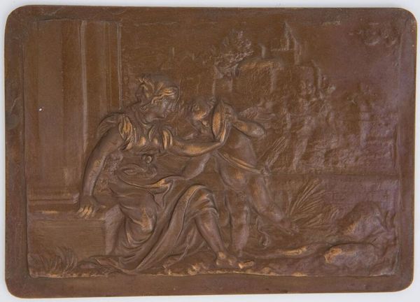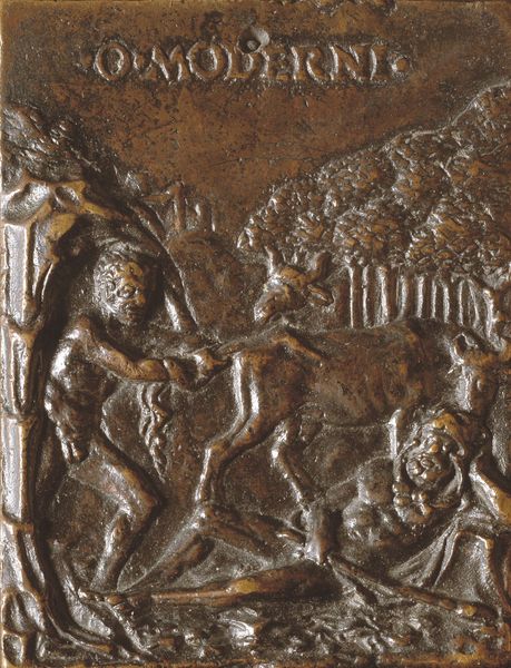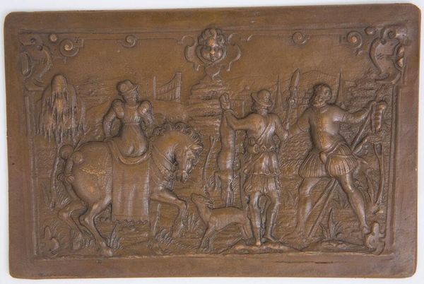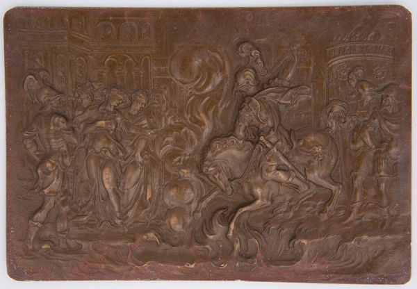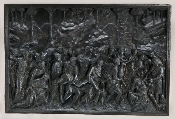 Editor: Here we have an anonymous bronze relief titled "Battle between the Romans and Sabines after the Rape of the Women" from the series "Scenes from Roman History." The small scale and chaotic composition convey a sense of immediacy. What symbols and cultural memory does this piece evoke for you? Curator: This work is saturated with symbols, isn’t it? The clash of swords, the shields… they represent not just a battle, but a struggle between cultures, between order and chaos. The abduction itself – consider what that signifies about power, gender, and the very foundation of Roman society. What feelings do those symbols evoke in you? Editor: I feel a sense of unease and a recognition of the cycle of violence. I appreciate that the artist chose to depict the battle, and not the rape, implying that a clash of values is at play. Curator: Exactly. And by focusing on the battle, the artist emphasizes the consequences of that initial act of violence, its lasting impact. It’s a visual reminder of how cultural trauma can be perpetuated through generations. Perhaps the artist wanted to explore the way conflict shapes identity and memory? Editor: That's a new perspective for me. Thanks, this helped me unpack the artwork and understand its themes in a fresh way.