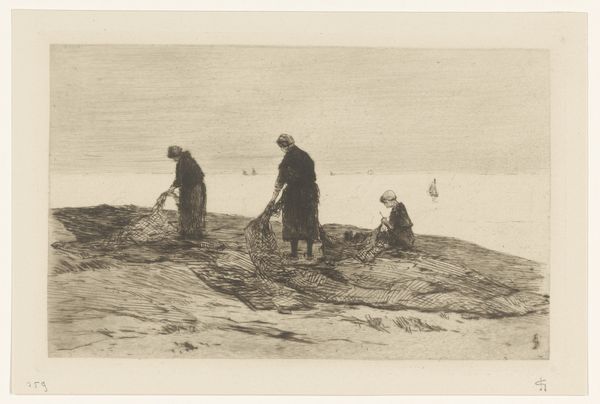 Curator: Immediately, I notice a somber quality. The etching is predominantly dark, with these clustered, nervous lines giving a palpable sense of the density of the hay and a sky weighed down by cloud. Editor: We're looking at "Woman Haymaker at Éragny," a piece realized by Camille Pissarro in 1897. He returned to the rural setting of Éragny after a period of urban scenes, drawn to this image of agricultural labor. It’s an etching, so printed on paper. Curator: The focus on labor is interesting. Notice how the composition forces us to confront the repetitive, almost cyclical nature of the haymaking. Pissarro hasn’t romanticized this labor, but presented it with unflinching realism, showcasing the physical exertion. How does this intersect with gender dynamics? Editor: Exactly. The depiction of women engaged in this work speaks to the crucial role women played in agricultural societies. They're not idealized figures, but laborers whose efforts contributed to the economic backbone of their communities. It forces us to question traditional, often patriarchal, narratives about work and visibility. Who has historically had their labor erased? And how is art complicit or resistant in this process? Curator: And the medium itself—etching—becomes a point of emphasis. The network of lines almost mimics the patterns of the fields, emphasizing the laborious hand of both the farmer and the artist. What kind of acid was used to etch this image into metal? It's the corrosive quality that mirrors the toll agricultural work takes on the body. Editor: Consider the socioeconomic context; late 19th-century France was witnessing industrial transformations, shifting populations, and changes in agrarian life. Pissarro's turn towards rural subjects can be viewed as a political commentary. The painting resists the allure of industrial progress by acknowledging the toils and traditional practices of rural existence. Curator: I agree. He gives importance to what industrial capitalism so easily forgets, which allows the working class to reclaim their narrative through images of physical effort. Editor: Absolutely. This image speaks volumes about labor, gender, and visibility. The muted aesthetic invites contemplation of how power and representation have shifted through time. Curator: And prompts a discussion about labor conditions of rural, agricultural economies. This isn’t only aesthetic, but crucial to broader questions about land use and rural poverty. Editor: Food for thought, indeed.