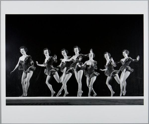 Editor: This is Harold Edgerton's "Moving Skip Rope" from Harvard Art Museums. The figure of a girl jumping rope is repeated across the image, capturing a sense of motion. It feels almost scientific. What is your take on it? Curator: Edgerton's work transcends mere scientific documentation. Think about the post-war era. What does this fleeting image, dissected and analyzed, say about the societal expectations of women's bodies and their performative roles? Editor: So you're saying it's about more than just freezing a moment in time? Curator: Precisely. It’s about questioning the very act of observation and its inherent power dynamics. What are we doing when we dissect and display this moment? Editor: That definitely gives me a new perspective to consider! Curator: Indeed. It challenges us to reflect on the cultural forces shaping our understanding of movement, gender, and representation.