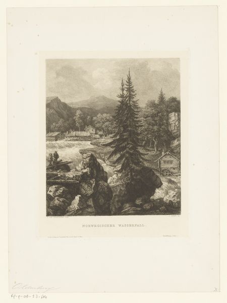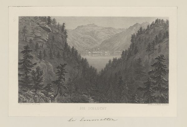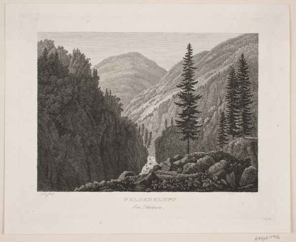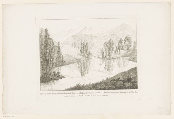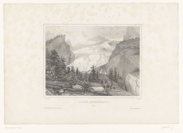 Curator: Here we have Louis Joseph Masquelier's "View of the Lower Grindelwald Glacier," created sometime between 1751 and 1811. It's an etching, meticulously crafted through the intaglio process. Editor: The grayscale immediately sets a solemn, almost haunting mood. It's an impressive display of tonal range, given the limitations of the medium. The composition draws my eye upward, toward those towering pines and the glacial vista. Curator: The picturesque style, a precursor to Romanticism, is very much at play here. Note how Masquelier uses the foreground figures and the rustic fence to frame the overwhelming grandeur of the natural landscape. The artist's rendering implies a sublime contrast between human scale and the infinite space, a common trait of the movement's emphasis on subjective emotional responses to nature. Editor: It's interesting how the artist uses line work to distinguish between the textures: dense, almost chaotic hatching to evoke the foliage versus the more regular patterns used for the cloudy sky and the distant mountain ranges. What do you make of the small human figures down in the left corner? Are they intended to be allegorical, or just… present? Curator: The human element in landscape depictions during this era often functioned as a means to establish perspective. They could also symbolize humankind's place within or alongside nature, perhaps an aspiration toward harmonious coexistence, depending on the setting and artist's philosophy. This ties into the broader 18th-century fascination with pastoral scenes and idealized natural settings. Editor: Still, those distant icy peaks – so coolly rendered. Even as someone who favors the abstract, the detail given to light and shadow really makes an impact. How do we situate such landscape imagery in an era of intense political upheaval and revolution? Curator: Precisely. That socio-political dimension provides crucial context. The artistic choice to focus on unspoiled, immutable natural landscapes also speaks to contemporary social unrest and fleeting revolutionary fervor, an escape into an imagined simpler past. Editor: Masquelier truly captures that interplay between observation, ideology, and emotional expression inherent in 18th-century art and the birth of landscape painting. Curator: Indeed, viewing this print allows one to trace both formal evolutions within visual art and broader developments throughout 18th century social constructs.