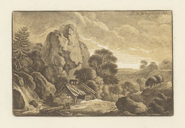 Editor: This is "Rocky Landscape with the Sea" by Frederick Bloemaert, likely after 1647. It's a pen and ink drawing. There's something about the starkness of the landscape, the way the rocks are rendered, that feels almost melancholic. What do you see in this piece? Curator: The starkness you mention is key. Landscape, especially in this era, becomes less about accurate depiction and more about evoking a mood, an emotional space. Bloemaert uses line and form here to tap into very old visual traditions of wilderness as both threatening and sublime. Do you see any small figures inhabiting this rocky scene? Editor: Yes, I see a few, almost swallowed up by the landscape. There are two figures with walking sticks up on the hill, and then a seated and standing figure further down on the rocks. Curator: Precisely. And what does their presence, dwarfed as they are, suggest to you? Consider that even small figures become allegorical, especially figures traveling with walking sticks! This wasn't just a drawing of rocks; it's about a spiritual journey. Note, also, how similar are the visual structures between mountains, pyramids and ziggurats. They are primal human shapes for seeking enlightenment. Bloemaert seems fascinated by these symbols. Editor: So it's less about the real world and more about inner exploration, almost like a dreamscape with familiar symbols, if I understand. Curator: Exactly! These symbols carry immense psychological weight through time. This connects us to a deep cultural memory of journey and transformation. The drawing has a potent emotional message despite its simple execution. Editor: I had no idea it was so rich in symbols! I was just thinking of the cool drawing style! Curator: Well, perhaps the artist intended the image to work on both levels. What one person perceives as "a cool drawing style" can actually touch on ancient visual traditions!