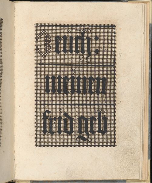 Curator: Here we have a page, specifically page 7 verso, from "Ce est ung tractat de la noble art de leguille ascavoir ouvraiges de spaigne...", a book dating from between 1527 and 1540 by Willem Vosterman. The work is currently held at The Metropolitan Museum of Art. It’s a woodcut print on paper. Editor: It strikes me as utterly charming, in a stark way. The black-on-cream, grid-like background almost overwhelms the lettering and designs, making it feel like a secret code waiting to be deciphered. Like a vintage 8-bit videogame visual. Curator: Yes, the use of black and white is particularly effective in creating contrast and highlighting the intricate designs. Notice the compartmentalization. The three distinct blocks. The letterforms appear almost architectural, quite imposing in their structure. This reflects Vosterman's keen eye for detail and design principles rooted in order and clarity. Editor: And yet, within those strict lines, there’s a playfulness. Those floral motifs at the bottom feel very free and organic compared to the rigid grid and those severe Gothic letterforms. A kind of controlled whimsy. I imagine the patterns offered inspiration for embroidery samplers, didn't they? Curator: Precisely. These prints served a didactic purpose, as patterns and models. "Ce est ung tractat..." provided templates for textile workers; thus, its structure allows the needleworker to scale the patterns as required. But the design also demonstrates the fusion of practicality and the decorative arts during the Renaissance, showing us the significance of textile design in broader artistic expression. Editor: So, it's a how-to manual elevated to art, something functional becoming beautiful, a quiet conversation across centuries about craft and intention. It gives you a certain sense of comfort that we keep coming back to making. Curator: An astute observation. I’m left reflecting on the intersection of craft and art, and how something ostensibly functional can transcend its utility and achieve enduring aesthetic value. Editor: And I’m dreaming of cross-stitch patterns and the gentle rhythm of needle and thread. How such a simple image can ignite such a tangible sense of nostalgia!