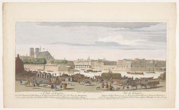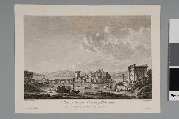 Editor: We're looking at "Gezicht op de Bastille en de Porte Saint-Antoine te Parijs," a watercolor by Robert Sayer, created around 1749. The pastel hues and seemingly placid everyday street activity belie the fact that we’re viewing a fortress and a gate which, 40 years later, would become symbols of revolution. How should we interpret that tension? Curator: Exactly. It's easy to look past the fortress aspect of this seemingly innocuous cityscape, isn't it? But think about the gaze implied here. Sayer, as an artist reproducing this image for an English audience, isn’t simply showing them Paris. He is framing a specific narrative, one of power and order viewed from a safe, detached distance. What does it mean to picturesque a site of future unrest? Editor: So, it's less about the objective reality of Paris and more about constructing a particular image for a foreign audience? Does the Rococo style, with its focus on lightness and ornamentation, further soften the political implications? Curator: Precisely. The Rococo aesthetic here functions almost as a form of visual propaganda, masking the underlying tensions within French society. Consider, too, that the Bastille was not just a fortress; it was a prison, a symbol of arbitrary royal authority. Who is excluded from this picturesque scene? Editor: Those imprisoned, certainly. The marginalized. This seemingly innocuous city view becomes a commentary on power, perspective, and the seeds of revolution obscured beneath a veneer of beauty. Curator: Right. This image reveals the critical function of art in shaping perceptions, isn't it? Even the most seemingly innocent depictions can reinforce specific ideologies and power structures. Editor: I agree. It encourages a more critical way of viewing art - to look beyond the surface, to consider the historical, social, and political context in which it was created and consumed. Thank you for highlighting how visual imagery participates in those conversations.