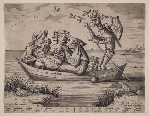 Curator: Before us is an etching and engraving titled "The Blue Boat," likely made between 1559 and 1676 after Hieronymus Bosch and attributed to Pieter van der Heyden. It's currently held in the Rijksmuseum. Editor: Immediately, there’s a feeling of satirical chaos. The line work is dense, creating a sense of disarray and unease despite the rather mundane activity of being on a boat. The overall tonality reinforces a feeling of turbidity and moral ambiguity, if that’s a fair read at this early stage? Curator: A very fair read, I think. The scene is rife with symbolic figures engaged in what appears to be wanton merriment. Note the ship of fools being ferried along by a character whose dress seems almost purposely absurd with a large wheel shield and cooking pot balanced atop his head, a fool steering a fool's ship to nowhere pleasant. It adheres to an allegorical visual style. The careful hatching is masterful in representing tonal variety despite relying on limited texture. The work, on closer examination, employs dense layers and sharp contrast to accentuate a somewhat grim and grotesque, but nevertheless satirical scene. Editor: Agreed. There’s a distinct contrast between the densely populated boat and the relative emptiness of the surrounding water and sky, which only serves to amplify the sense of claustrophobia and impending doom aboard the "Blau Schuyte" itself. What I find fascinating is how a rather humble and, if I’m not mistaken, somewhat widely distributed print manages to convey so effectively quite a potent moral message about the dangers of excess and folly. These figures willingly succumb to the pleasure cruise unaware they are literally traveling toward hell, and who is driving the boat? Quite clearly someone ridiculous with no clear direction or competence. Curator: Absolutely, this engraving certainly speaks to broader cultural anxieties around moral decline during the Northern Renaissance period. By repurposing Bosch's allegorical imagery, van der Heyden’s interpretation participates in, while subtly commenting on the cultural fascination with vice and virtue evident in the era’s print culture, even adopting aspects of genre painting. Editor: So, essentially, what initially feels like an accessible commentary through careful composition quickly reveals a sharp critical engagement. A testament to its lasting power. Curator: Precisely, and perhaps what at first appears simplistic is highly effective criticism, a common subject in artistic works of this period. Editor: A vital piece indeed, revealing its complexity slowly to the perceptive viewer.