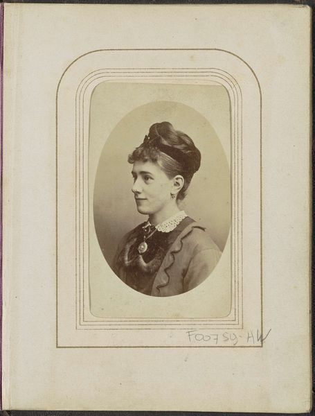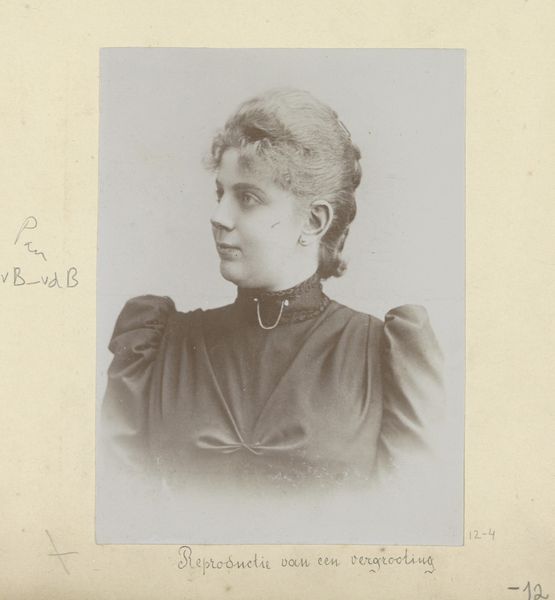 Curator: The image we are looking at is a photograph titled "Portret van Philippa Fawcett" taken before 1891 by Hugh Owen. Editor: The portrait has a delicate, almost melancholic feel. The soft grayscale tones emphasize the subject’s introspective gaze. It reminds me of a painting more than photography. Curator: Yes, the soft focus and lighting create a dreamlike quality, obscuring a precise time and place for viewing this important figure. Philippa Fawcett was a brilliant mathematician and educational administrator at a time when access to those fields were highly restricted to women. Looking at the portrait, I notice how Owen seems to be presenting a serious woman on the precipice of great intellectual contributions. Editor: Notice how the lines in her dress guide the eye, starting from the elaborate high neckline down the buttoned front to the simple black sash—anchoring the figure’s middle before releasing it to the modestly clasped hands. There is an interesting mix of adornment with structural precision, a parallel, perhaps, with her intellectual contributions? Curator: Precisely. She embodies the struggle for recognition and advancement that women face even today. Her achievements broke boundaries and provided pathways, influencing how we understand intellect and gender roles. And this very subdued photography shows the period’s restrictions that influenced Fawcett’s way of moving in the world. The portrait encapsulates not just an individual but a pivotal moment in gender and academic history. Editor: Ultimately, it's the balanced composition that holds my gaze. Owen uses tonality and subtle detailing to highlight a woman whose inner fortitude deserved to be seen and honored. I like how you see the constraints that actually affected the artist's creation of the image. Curator: And perhaps those same restrictions influenced her hands modestly placed in front of her. Thinking of the historical context reframes this piece, doesn’t it? Editor: Absolutely. It is like the image creates multiple layers for the viewer.