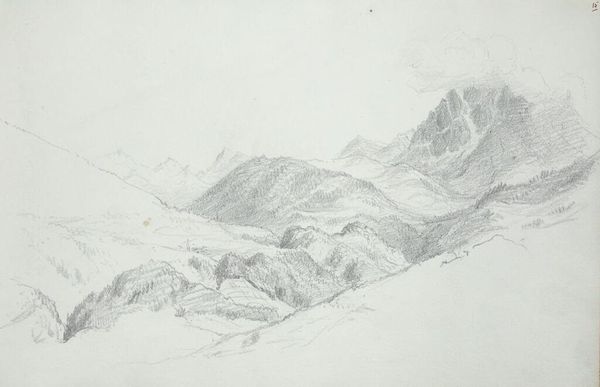 Curator: Here we have John Singer Sargent's pencil drawing, "Mountain Landscape, Gurgl, Austria". Editor: It's quite stark, isn't it? The mountains seem to close in, almost oppressive in their scale. Curator: Sargent made this sketch in July of 1870; it is now held at the Harvard Art Museums. The scene's remoteness reflects a broader fascination with untouched landscapes. Editor: The jagged peaks evoke a sense of sublime power. The slight river at the bottom suggests the hand of nature, subtly guiding the viewer's eye through this imposing scene. The symbol of mountain peaks often speaks to a search for clarity. Curator: Sargent was known for his society portraits; this sketch offers a glimpse into his personal exploration of landscape, free from societal demands. Editor: It's a study in contrasts. A delicate pencil sketch of something so monumental. Curator: It shows the changing role of landscape art from being just a backdrop to the main subject to becoming the main subject itself. Editor: It leaves me with a feeling of awe, tinged with a bit of melancholy. Curator: It reveals a different facet of Sargent, less polished, perhaps more earnest.