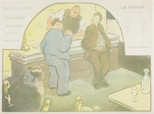 Curator: "-Le Rire- magazine," from 1899, is a lithographic print, effectively a poster, designed in the Art Nouveau style. It presents an interesting glimpse into late 19th-century France. What strikes you initially about it? Editor: Well, the domestic scene is quite evocative. I immediately focus on the figure hunched over her sewing. What's interesting is all the labor implied – it feels grounded in the realities of making and mending. What stands out to you? Curator: Precisely! Let's consider this in light of materialist analysis. We see here not just an image, but evidence of the labor required for the very existence of popular visual culture. The lithograph itself is a mass-produced print intended for wide circulation. How do the means of production inherent in a magazine influence the message it's sending? Editor: So, instead of seeing it as "high art," you see its production and distribution – like the role of printing and how that affects what the image means. The caption, “What young girls dream of,” alongside the illustration, suggests an implied narrative for female consumption...almost like advertising? Curator: Exactly. Consider the labor involved – both in the making of the magazine and within the scene depicted: the seamstress sewing. It challenges a Romanticized idea of labor as something separate from capital, no? It reflects, in many ways, anxieties that new, faster forms of making, like industrialization, stirred up about craftsmanship at that time. Editor: That makes me see it differently! It’s not just a cute magazine cover; it reveals this interesting push-and-pull between different modes of production and how it impacted perception of women. It reflects cultural shifts. Curator: It reflects and participates in them, actually! We get a fuller sense of the historical currents shaping art when we bring the realities of the process and materials involved into focus, don’t you think? Editor: Definitely. Looking at it from that angle changes everything.