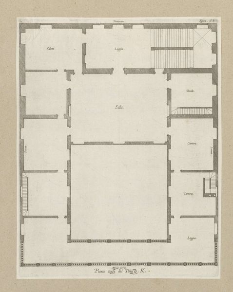 Editor: We're looking at "Plattegrond van de begane grond van het Palazzo della Meridiana te Genua," a drawing made with ink on paper by Nicolaes Ryckmans in 1622. It’s currently held in the Rijksmuseum. It's a precise architectural plan, almost like a blueprint. What's striking to you about it? Curator: This drawing offers a glimpse into the societal values of 17th-century Genoa. The Palazzo della Meridiana, and therefore this ground-floor plan, wasn’t just a building; it was a statement. What does the emphasis on geometry and clear divisions within the space suggest about the power dynamics within the household and, by extension, the city? Editor: So, it's about more than just where the rooms are? Curator: Absolutely. The precise linework and symmetrical organization reflect a desire for control and order, very much in line with the Baroque era's embrace of reason and imposing structures. Consider how this drawing might have been used: not just for construction, but also as a tool to impress potential investors or solidify the family's social standing. How do you think displaying such plans reinforced the patron's authority? Editor: It feels like showing off, maybe. Look how organized and important we are! It definitely gives the impression of wealth. Curator: Precisely. Architectural plans became powerful symbols, shaping public perception of wealth and influence. The level of detail suggests a wealthy patron concerned with legacy, control, and demonstrating power through rational design. Editor: It’s amazing to think that even something seemingly practical like a floor plan could carry so much cultural weight. Thanks! Curator: Indeed, examining art within its historical and social context truly deepens our understanding of its purpose and meaning. This plan becomes a silent narrative about power, wealth and control.