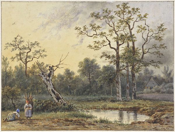 Editor: So, this watercolor piece is called "Landschap met figuren in een roeibootje", which translates to "Landscape with figures in a rowing boat", attributed to Georgius Jacobus Johannes van Os, created sometime between 1792 and 1861. The detail is incredible for the size and medium, it looks almost photographic but softens as you look around the scenery, I wonder, what are your initial observations? Curator: Structurally, the work reveals a fascinating interplay of planes. The artist deploys the water surface as a horizontal anchor, reflecting the surrounding landscape and doubling the visual information presented to the viewer. The density of the foliage on the right side creates a visual weight that's carefully counterbalanced by the lighter, cloud-filled sky. Note how this upper expanse repeats forms from below. Editor: That makes a lot of sense! I hadn't quite thought about the cloud and water as matching forms and planes. Can you elaborate more about the focal point and its relation to its surroundings? Curator: Observe the subtle gradation of tones – how van Os transitions from the dark foreground elements to the muted background hues, creating a sense of depth and atmosphere. Note the reflections are slightly abstracted; it is clear this wasn't merely copied from observation. Instead, the artist constructs an alternate reality through manipulating tonal values and hues in relation to the structural aspects of the work. Do you agree with my analysis? Editor: Yes, definitely. The shift between the precise boat details to the more impressionistic treatment of the surrounding trees becomes even more pronounced with your reading. Thanks so much. Curator: Indeed. Considering the artist and timeframe, thinking in these compositional terms is a valuable means of interpretation. I also find that appreciating a structural approach allows for additional perspectives that enriches understanding beyond iconography and other traditional routes.