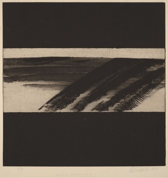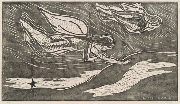 Editor: This is Paul Shaub's "Rowing Alone," created in 1962 using linocut, I think. It’s such a somber image, really stripped down, just the boat and rower in this vast expanse of water. What do you see in it? Curator: I see a piece deeply embedded in the social anxieties of the early 1960s. This lone figure resonates with the rising tide of existentialism, reflecting the individual’s isolation in a rapidly changing world. Think about the Cold War, the threat of nuclear annihilation. Doesn't that silhouette evoke a sense of vulnerability and quiet desperation amidst those larger geopolitical currents? Editor: Definitely. The starkness of the linocut, its monochrome palette… it amplifies that feeling of isolation, doesn’t it? But does the medium itself contribute to that feeling beyond just the color? Curator: Absolutely. The roughness inherent in linocut printmaking – those visible tool marks – mirrors the harsh realities of the time. It wasn't a polished, idealized world, and the artwork reflects that through its deliberate lack of refinement. How might public perception of art have shaped Shaub's artistic choices and message? Editor: I guess that the more raw execution challenges traditional aesthetic expectations, which mirrors society’s disillusionment with established norms. It’s like Shaub is saying, "This is the real, unvarnished truth.” Curator: Precisely. Consider too, the public role of art at the time. Was it to soothe, or to provoke? "Rowing Alone" clearly aligns with the latter. A potent reminder that art is not just decoration but a carrier of societal anxieties and critical perspectives. Editor: It makes you rethink simple aesthetic appreciation, doesn't it? There's so much more at play in shaping our understanding of even the loneliest boat. Curator: Exactly. Art and society are perpetually intertwined.